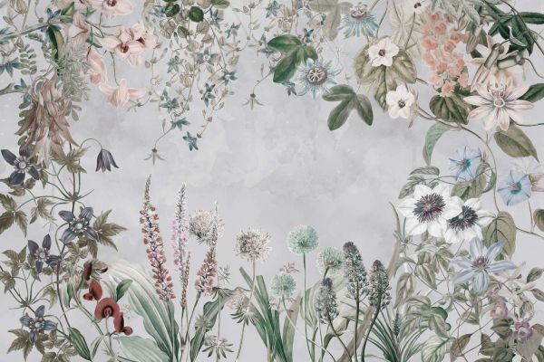 Denna design utstrålar en förtrollande skönhet genom en harmonisk blandning av blommor och växter, som återspeglar både elegans och lekfullhet. De rika detaljerna i bladen och blommorna, i kombination med en subtil palett av pastellfärger och mjuka jordtoner, gör den livlig och raffinerad. Den graciösa kompositionen skapar en inbjudande atmosfär, perfekt för utrymmen som kräver ett lugnt och naturligt utseende.
