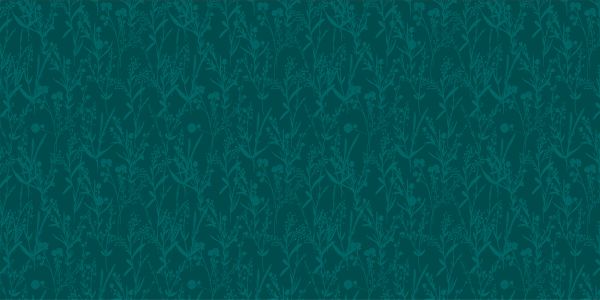 Ett unikt mönster av olika blommor, grenar och blad slumpmässigt utspridda i färgen teal.