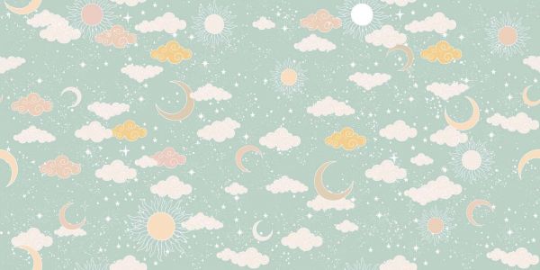 Denna design fångar skönheten i en sagolik himmel, där dag och natt möts i harmoni. Den mintgröna bakgrunden utstrålar lugn och utgör en perfekt duk för graciösa virvelmoln i vitt, persika och mjukt orange. Bland molnen svävar lätta halvmånar i varma toner och solar med fina, handritade strålar. Gnistrande stjärnor och subtila stänk gör helheten luftig och magisk, utan att vara rörig eller överväldigande.