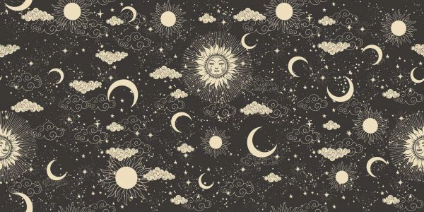 Denna design är en visuell hyllning till kosmos, inspirerad av klassiska stjärnkartor och mystiska illustrationer. Solar med strålande linjer – vissa med fridfulla ansikten – avlöses av graciösa månskäror, virvlande moln och glittrande stjärnor. De fina detaljlinjerna ger helheten ett hantverksmässigt, vintageutseende. Den djupa svarta bakgrunden framhäver de ljusa illustrationerna, vilket skapar kontrast och elegans.