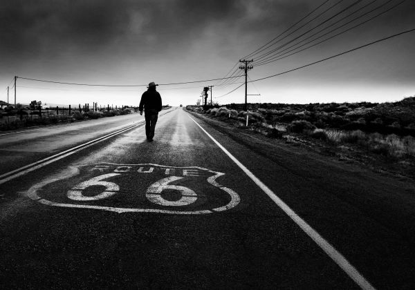 Denna gamla väg ligger mellan en öken, vilket ger en djärv effekt. Fotoet är i svartvitt.