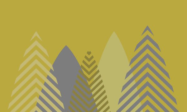 Mörk gul bakgrund med en blochning av randiga och färgade berg i olika nyanser av grått och gult.