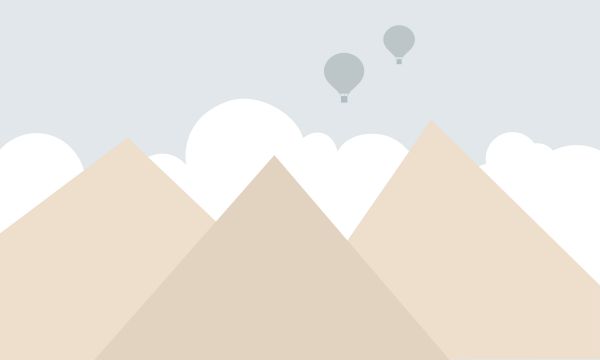Höga berg i beige tpåer med en blå himmel och moln i bakgrunden. Två luftballpåger flyter över bergen.