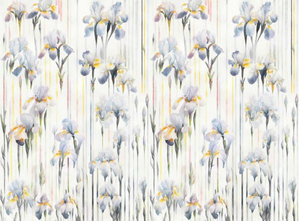 Sirliga irisar i djupa blå nyanser accentueras av subtila akvarellstreck på en ljus bakgrund. Kombinationen av mjuka penseldrag och kalla färgnyanser skapar ett elegant och lugnande utseende. Vertikala accenter i olika blå nyanser ger helheten en modern och raffinerad dynamik.