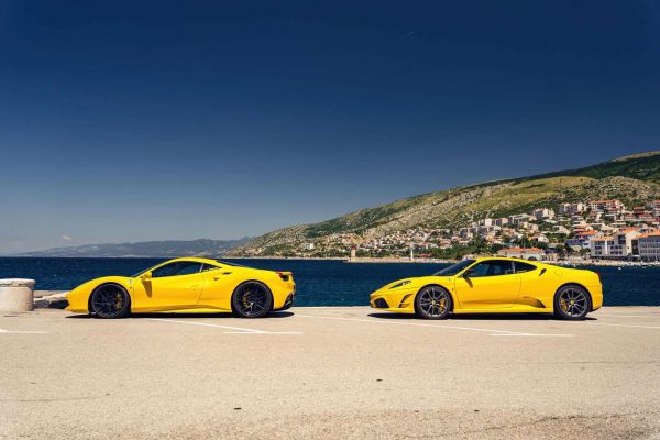 Två ikoniska gula Ferrari-bilar, 488 GTB och F430 Scuderia, utstrålar ren kraft och elegans vid den soliga kusten. Det azurblå havet och de pittoreska kullarna utgör den perfekta bakgrunden för dessa italienska mästerverk.