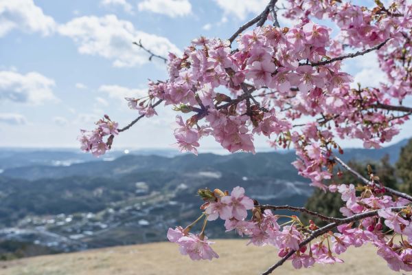 En detaljerad bild av rosa japanska blommor med berg i bakgrunden.