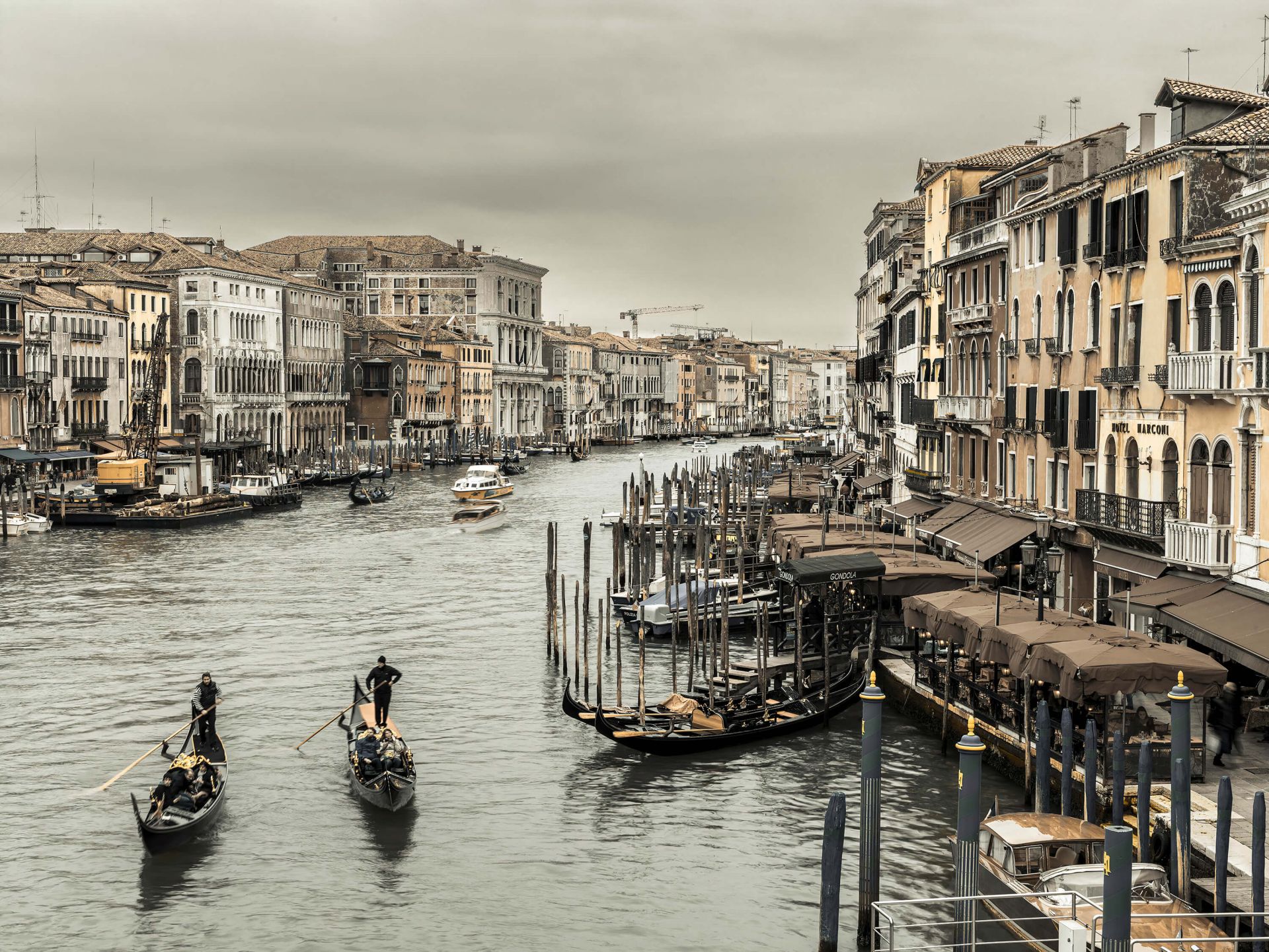 Den stora kanalen vid Rialtobron i Venedig, Italien, en molnig dag.