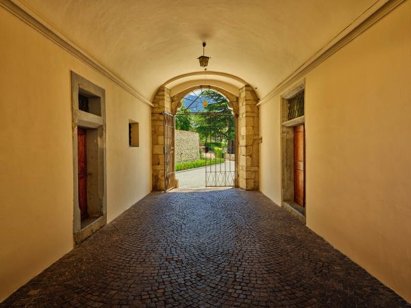 Passage i ett kloster en solig dag. Med den här fototapeten i ditt hem är det som om du kan gå ner i korridoren.