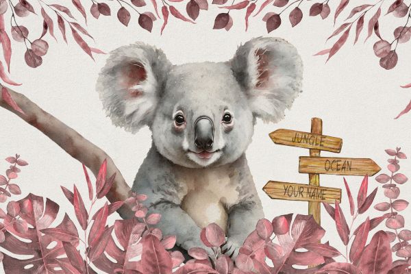 Den här charmiga bilden fångar essensen av en ung, bedårande koala som ligger inbäddad bland frodiga rosa blad. Koalans grå päls har en mjuk struktur mot de livfulla rosa tonerna i bakgrunden, vilket ger bilden ett drömskt och lugnande intryck.