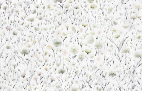 Ett drömlikt och förfinat blommönster med delikata vildblommor i mjuka gröna nyanser. Den subtila akvarelltekniken och luftiga kompositionen ger en fräsch, naturlig känsla. Denna ljusa och eleganta design skapar lugn och serenitet i varje rum.