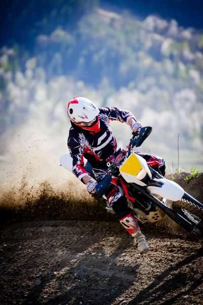 Crosscykel som går djupt genom krökningen på en lerig terräng.