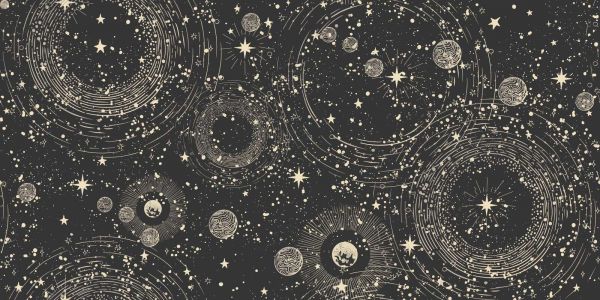 En fascinerande stjärnhimmel full av spiralformade stjärnhopar, planeter och stjärnbanor i mjuk krämfärg mot svart. Designen utstrålar mystik, rörelse och rumsligt djup.