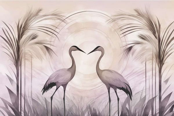 Två eleganta tranor står harmoniskt mittemot varandra, omgivna av prydliga palmer och en subtilt lagerad bakgrund. De mjuka beige och gråbruna nyanser utstrålar serenitet och lugn. Den delikata akvarellstilen och den symmetriska kompositionen ger helheten en drömlik, nästan meditativ känsla.