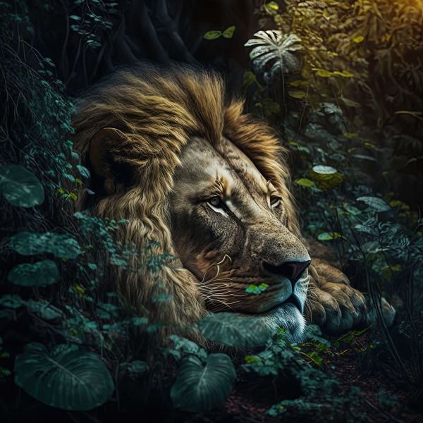 Fototapet av ett lejon i djungeln. Kombinera den här tapeten till exempel i ditt vardagsrum.