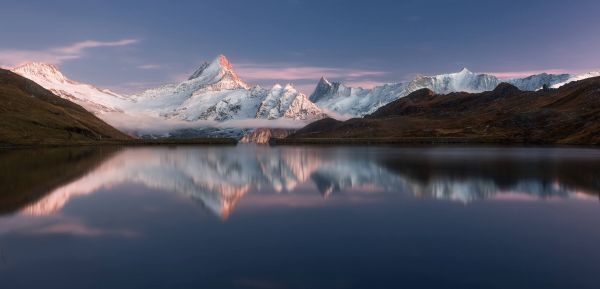 Lake Bahalpsee, i bakgrunden kan du se molnen hänga mellan de snöiga bergen.
