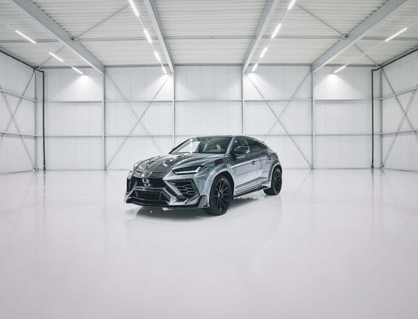 Lamborghini Urus Mansory i en vackert upplyst vit industrihall.