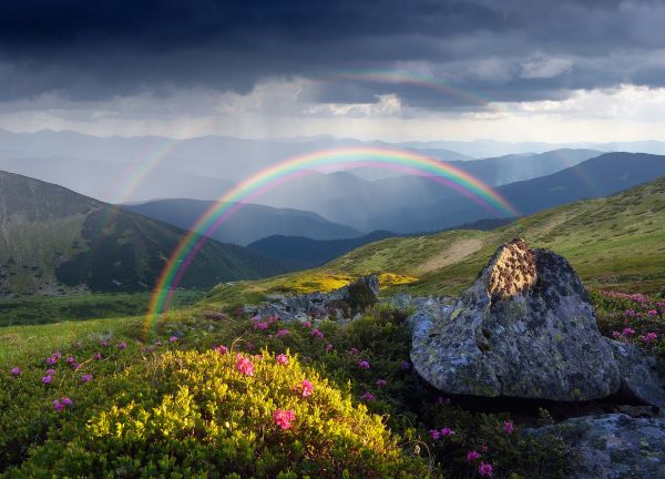 Landskap med blommor och regnbågar. Två regnbågar kan ses i landskapet, den ena något mer suddig än den andra.