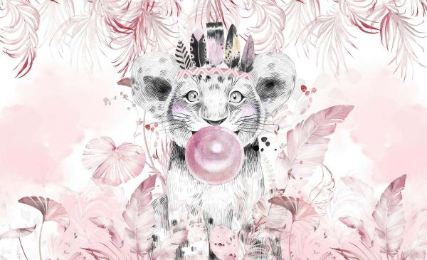 En charmig och lekfull lejonunge blåser en rosa tuggummibubbla bland drömlika, botaniska element. De mjuka akvarellnyanserna av rosa och grått, kombinerat med detaljerade blyertslinjer och lekfulla fjädrar, skapar en unik blandning av djungel- och boho-stil.