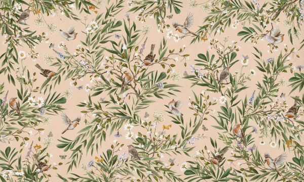 Detta eleganta design ger en romantisk bit blomsterträdgård till liv, där rödhakar sjunger och flyger mellan blommande grenar, vilda blommor och gröna blad. Illustrationerna är rika på detaljer men ljusa i tonen, med en mjuk beige bakgrund som lägger till värme och ljus utan att ta bort uppmärksamheten från designen. De botaniska elementen inkluderar bland annat prästkragar, lavendel, tusensköna och subtila fältblommor, blandat med fjärilar och nattfjärilar som virvlar mellan det gröna. Rödhakarna är livfullt och uttrycksfullt avbildade i naturliga toner, vilket ger designen en lekfull men naturlig karaktär. Kompositionen är luftig, med utrymme mellan grenar och blommor, vilket ger designen visuell andningsutrymme. Färganvändningen - mycket friskt grönt, vitt, varmt orange, mjukt lila och ljusa accenter - ger en inbjudande och tidlös känsla. Perfekt för en klassisk botanisk eller rustik lantlig inredning. Kombinera med trä- eller vita möbler, linne- eller bomullstextilier i naturliga toner och accessoarer i keramik eller rotting för att förstärka den naturliga atmosfären. Särskilt lämplig för sovrum, barnrum, vinterträdgårdar, korridorer eller vardagsrum där en lugn och vänlig atmosfär önskas. Även vacker i en läshörna, bed & breakfast eller restaurang med lantlig atmosfär.