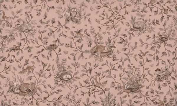 Ett romantiskt och stämningsfullt skogslandskap kommer till liv i denna illustrativa design med en varm puderrosa bas. Mitt i de graciösa ekgrenarna och små blommor vilar olika skogsdjur: kaniner sover på mjuka lövängar, ekorrar klättrar glatt mellan grenarna, fåglar vakar över sina bon och en uggla ser lugnt på från sin höga plats. Fjärilar, bin, sniglar och svampar ger extra magi och detaljer i denna noggrant uppbyggda scen. Den puderrosa bakgrunden ger helheten en mjuk, feminin känsla och bildar en vacker kontrast med de varma bruna och grå tonerna i bladen och djuren. Denna färgval gör designen särskilt lämplig för ett romantiskt barnrum eller en nostalgisk lantlig stil, där naturliga material och mjuka nyanser sätter tonen. Varje element är handritat med stor uppmärksamhet på detaljer. Djuren är avbildade i fridfull vila, vilket ger en lugn atmosfär som passar perfekt i rum där trygghet och ro önskas. Den organiska grenstrukturen ger en flytande rörelse genom helheten, vilket gör mönstret inte bara dekorativt utan också lugnande. Vackert att kombinera med möbler i ljust trä, rotting eller vitt, och med accessoarer i gammalrosa, varmt grått, beige eller koppar. Tänk på en romantisk himmel ovanför en vagga, mjuka plädar, filtade djurfigurer eller en klassisk matta. Perfekt för ett barnrum, flickrum, lekrum eller en mysig läshörna full av fantasi och lugn.