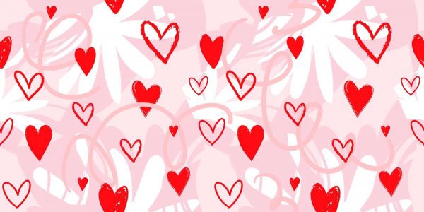 Ett glatt mönster fullt av röda och rosa hjärtan, lekfulla linjer och mjuka blomliknande former på en rosa bakgrund. De livfulla färgerna och den luftiga stilen skapar en romantisk och upplyftande stämning.