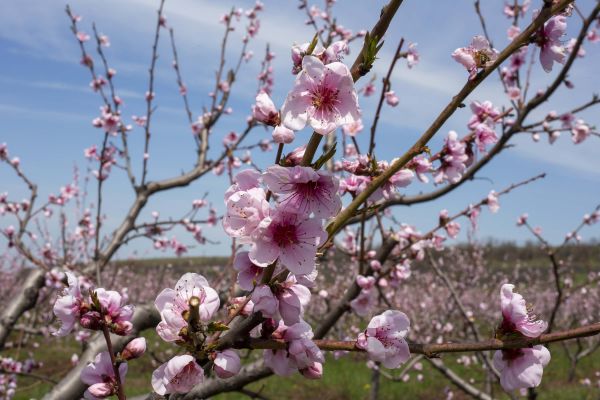 En detaljerad bild av ljusrosa blommor med grenar och gräs i bakgrunden.