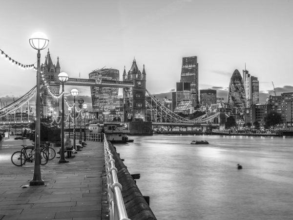 London Riverside Promenade på fototapet i svartvitt. Den perfekta tapeten för Londonälskare.