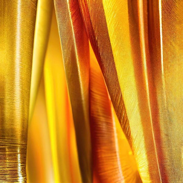 Skiktade remsor i guld, orange och gul bildar ett vågigt mönster som påminner om glänsande siden. Texturerna och reflektionerna skapar en varm, livlig ljusrörelse i en lyxig utförande.