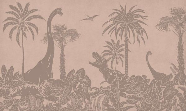 Ett förhistoriskt landskap med detaljerade dinosaurier mellan frodiga tropiska växter. Den djupt blå bakgrunden förstärker den dramatiska, vintage känslan, medan silhuetterna av dinosaurierna skapar en dynamisk kontrast.