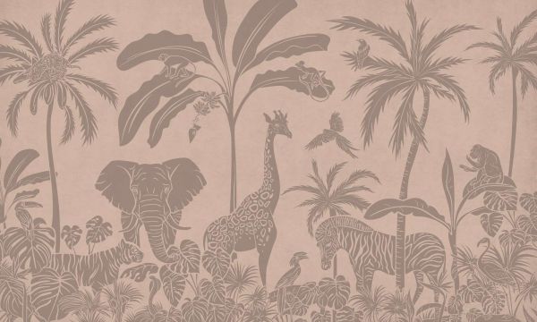 Ett exotiskt landskap fullt av vilda djur som elefanter, giraffer, zebror och apor, inramat av frodiga tropiska växter. Den mjuka rosa bakgrunden och illustrationerna ger helheten en vintage och lugn känsla.
