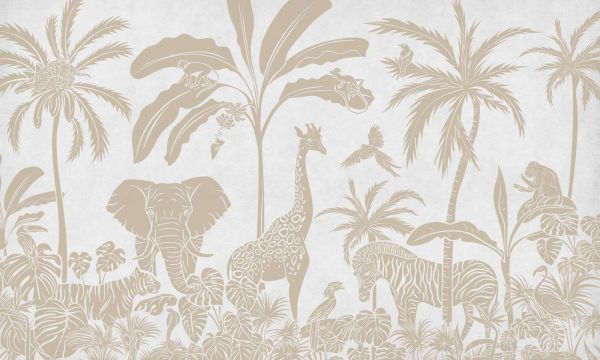 Ett exotiskt landskap fullt av vilda djur som elefanter, giraffer, zebror och apor, inramat av frodiga tropiska växter. Den mjuka rosa bakgrunden och illustrationerna ger helheten en vintage och lugn känsla.