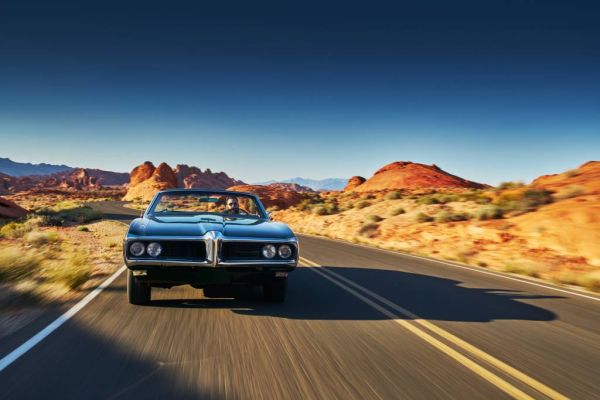 Fototapet med en ridoche muskelbil i ett soligt amerikanskt landskap