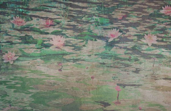 En förtrollande scen av en lugnande damm full av näckrosor utgör grunden för denna design. Mjukt rosa blommor flyter mellan de flytande bladen som i varierande gröna nyanser täcker vattnet. Bakgrunden är subtilt lagerlagd med en väderbiten textur, vilket ger helheten en nostalgisk, nästan impressionistisk karaktär. Bilden väcker minnen av Monets målningar, men med en modern twist i färg och atmosfär. Denna design kommer till sin rätt i en klassisk romantisk eller naturinspirerad inredningsstil. I en klassisk miljö utgör den en elegant vilopunkt i kombination med graciösa möbler, varma trädetaljer och textilier i gammalrosa eller salviagrönt. I en naturlig inredning passar den perfekt med ljusa träslag, rottingaccessoarer, stora krukväxter och linnetyger, vilket subtilt för in utomhusmiljön. Färgpaletten består av grågröna nyanser, mjukt rosa accenter och naturliga brunbeige toner, som tillsammans skapar en lugnande atmosfär. Detta gör designen idealisk för utrymmen som ett sovrum, läshörna eller meditationsrum, där avkoppling och harmoni står i centrum. Den lekfulla kompositionen av blad och blommor spridda över vattenytan ger rörelse och djup i rummet, utan att vara överväldigande. Genom den ljusa färganvändningen och den konstnärliga finishen känns designen luftig, men med tillräckligt med detaljer för att göra ett bestående intryck.
