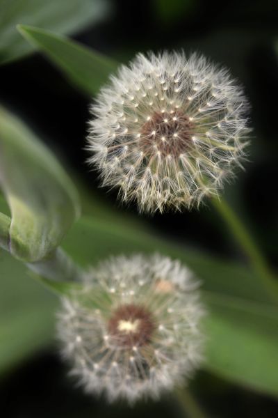 Ett detaljerat fotografi av en maskros med gröna blad på en mörk bakgrund.