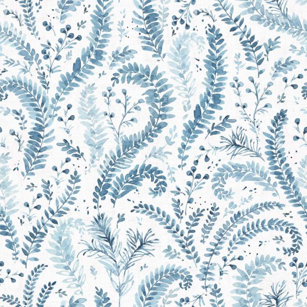 Ett luftigt mönster av akvarellmålade ormbunkar och bärkvistar i mjuka blå nyanser på en ljus linneliknande bakgrund. Helheten utstrålar lugn och naturlig elegans.