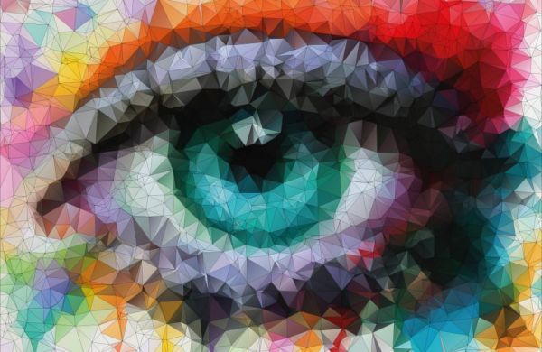 Unikt fototapet med et abstrakt øye bestående av fargede trekanter