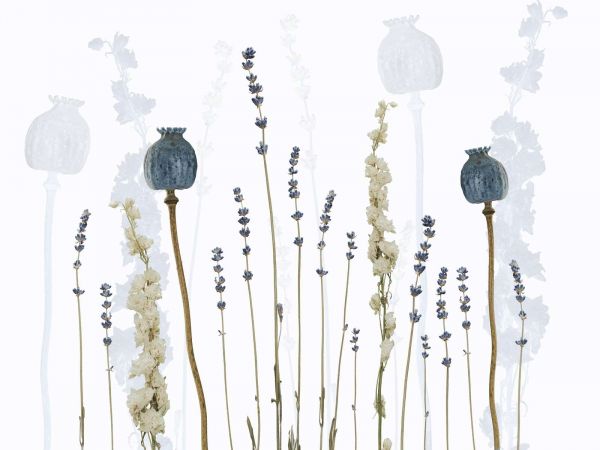 En drømmende samling av flora, presentert med en akvarellaktig mykhet. Bildets komposisjon viser valmuepærer og lavendel, hvis nyanser fra himmelblått til skylignende hvitt danner en eterisk hage. Den gjennomskinnelige bakgrunnen og de overlappende elementene antyder en drømmende, fredfull tilstand som innbyr til ettertanke og ro.