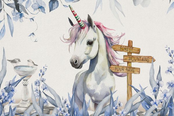 Dette bildet fanger magien til en enhjørningunge med en fargerik, virvlende manke som ser ut til å danse lekent i vinden. Enhjørningen er omgitt av et felt med blomstrende planter i blå nyanser og nysgjerrige fugler, og skaper en eventyrlig atmosfære i ethvert miljø.