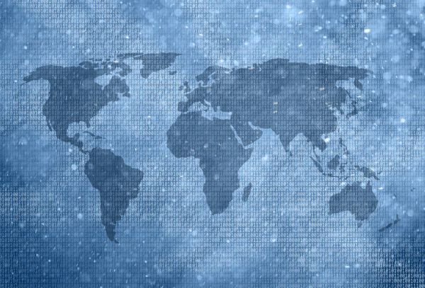 Abstrakt fototapet av verdenskartet dannet av lik og nuller og en flagrende effekt