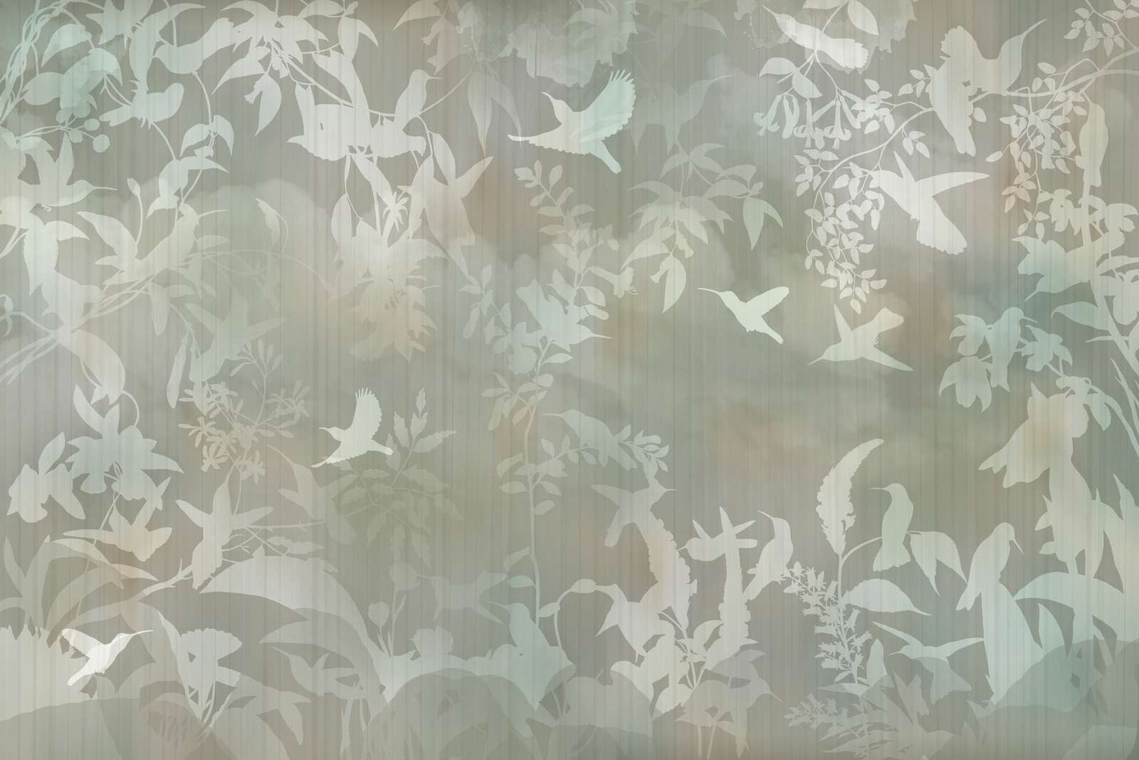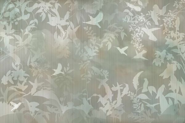 Denne rolige designen kombinerer de elegante formene til fugler i flukt med en subtil tåkete bakgrunn. De myke pastellnyansene blått, grønt og grått flyter harmonisk sammen og gir designet et beroligende utseende. Spillet av lys og skygge, med silhuetter av kolibrier og blader, skaper en følelse av dybde og mystikk.