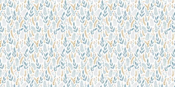 Blå tapet med mønster av forskjellige blader. Disse bladene er på en hvit bakgrunn.