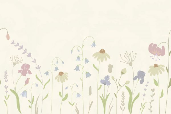 Høy blomstermark med forskjellige blomster. Farge: Beige med ulike farger som gammelrosa, grønn og syrin.