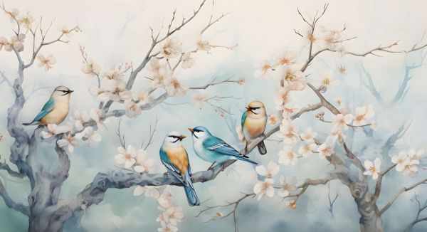 Myke fugler sitter elegant blant grenene av blomstrende blomster. Det subtile fargepalettet og den serene komposisjonen fremkaller en rolig følelse av en vårmorgen, der naturen våkner til en harmonisk melodi av farger og former.