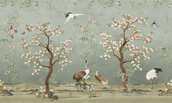Et harmonisk bilde av naturlig eleganse utfolder seg i dette rike designet, der yndefulle blomstrende trær og grasiøse traner spiller hovedrollen. Bakgrunnen er utført i en myk jadegrønn nyanse med en subtil tekstur som fremkaller stemningen av en malt silkevegg. Blomstene varierer fra kremhvit til pudderrosa og gammelrosa, mens grenene bøyer seg yndefullt over et beroligende landskap. Mellom blomstene flagrer sangfugler og sommerfugler, noe som gir det hele en livlig, men balansert karakter. Tranene, symboler på eleganse og harmoni, legger til et østlig og tidløst element til helheten. De beveger seg majestetisk mellom blomstrende busker, på en bakgrunn som minner om en asiatisk hage med myke åser og ville blomster. Designet passer perfekt til et klassisk, japansk eller romantisk interiør. Tenk på en setting med varme tretoner, silkeaktige stoffer og raffinerte møbler med runde former. Også innenfor et moderne interiør med rolige, nøytrale toner og minimalistiske linjer kan dette designet skape en kunstnerisk og stemningsfull kontrast. Svært egnet for bruk på et soverom, lesekrok eller en elegant gang, der ro og skjønnhet møtes. Kombiner med tilbehør i messing, keramikk eller bambus, og jobb med tekstiler i naturfarger eller gammelrosa aksenter for å forsterke den myke, raffinerte stemningen. Lyse tremøbler eller svartlakkerte detaljer kan begge danne en passende ramme, avhengig av den ønskede stilen.