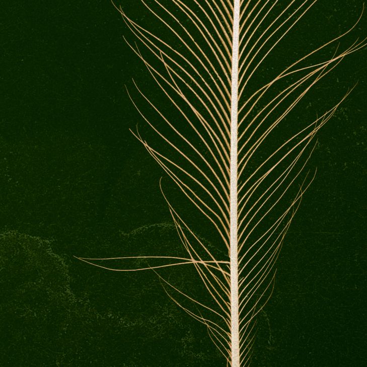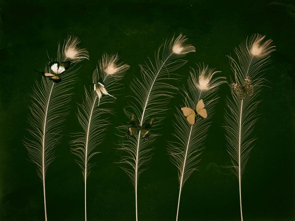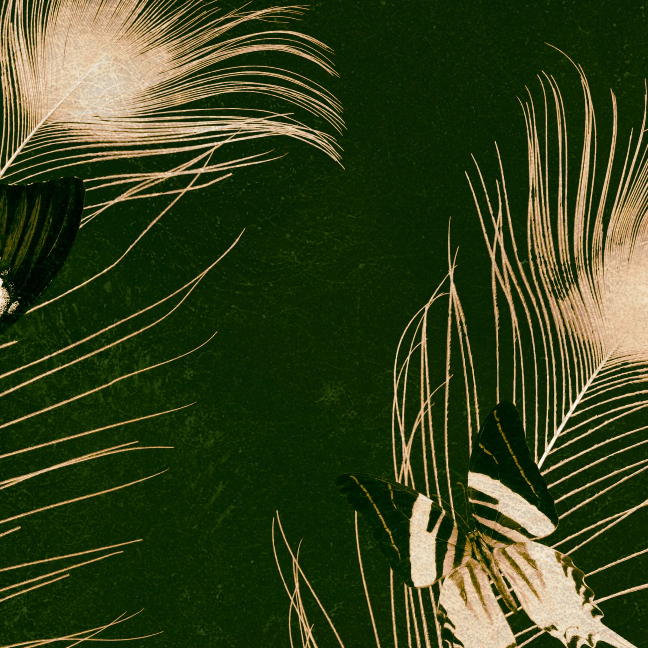 Sommerfugler på påfuglfjær og en vakker mørkegrønn bakgrunn.