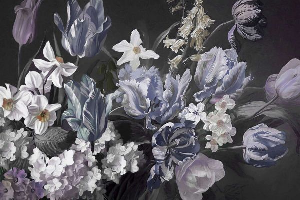 Et elegant og raffinert blomsterstilleben med tulipaner, påskeliljer og blomsterknopper i blågrå og lilla nyanser. Den mørke bakgrunnen skaper en dramatisk kontrast, som får de subtile penselstrøkene og delikate detaljene til å skille seg ekstra ut. En tidløs og luksuriøs komposisjon med et klassisk preg.