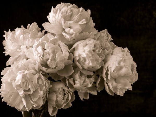 En haug med peoner i vintage stil. Sepiafargen på blomstene skaper en vintagestil i hjemmet ditt.
