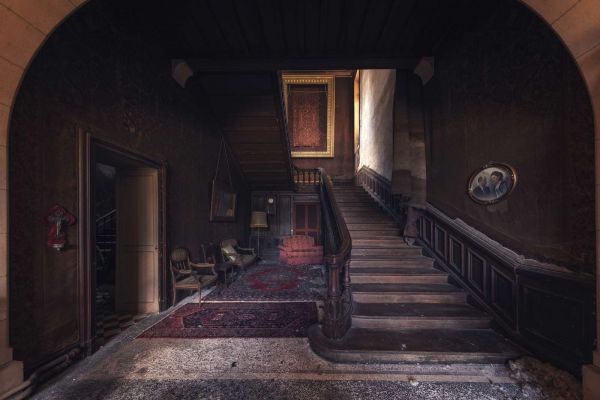 Trappen i et av de vakreste forlatte slottene i Frankrike. Ingen har bodd her på nesten 20 år, men likevel ser det ut som om eierne nettopp har forlatt stedet. Fullt møblert og fullt av minner venter dette huset på bedre tider.