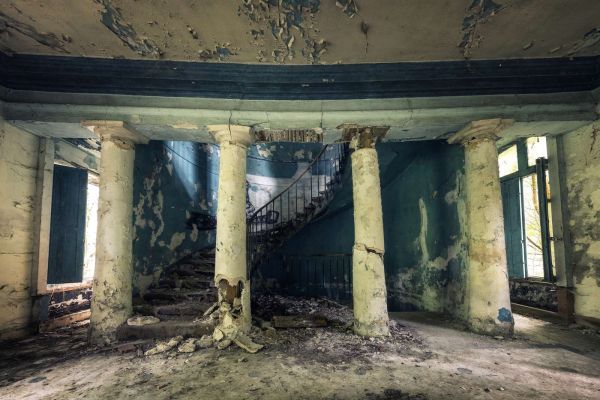 Litt til, og den en gang så praktfulle inngangshallen til dette slottet faller sammen. Fargene og atmosfæren er imidlertid noe helt spesielt.