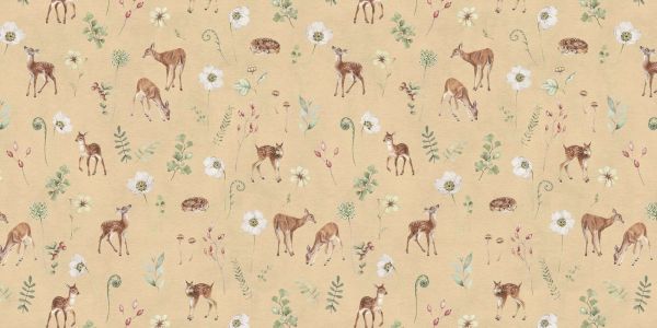 Et delikat skogsmønster med elegante hjort og subtile blomster i myke pastellfarger. Dette lekne designet utstråler en sjarmerende og naturlig atmosfære, perfekt for å tilføre et mykt og sjarmerende preg til ethvert rom.